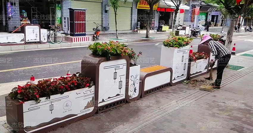 座椅花箱多見于城市街道、公園、廣場,這款座椅花箱以十足的國風韻味,傳遞出中式美學。