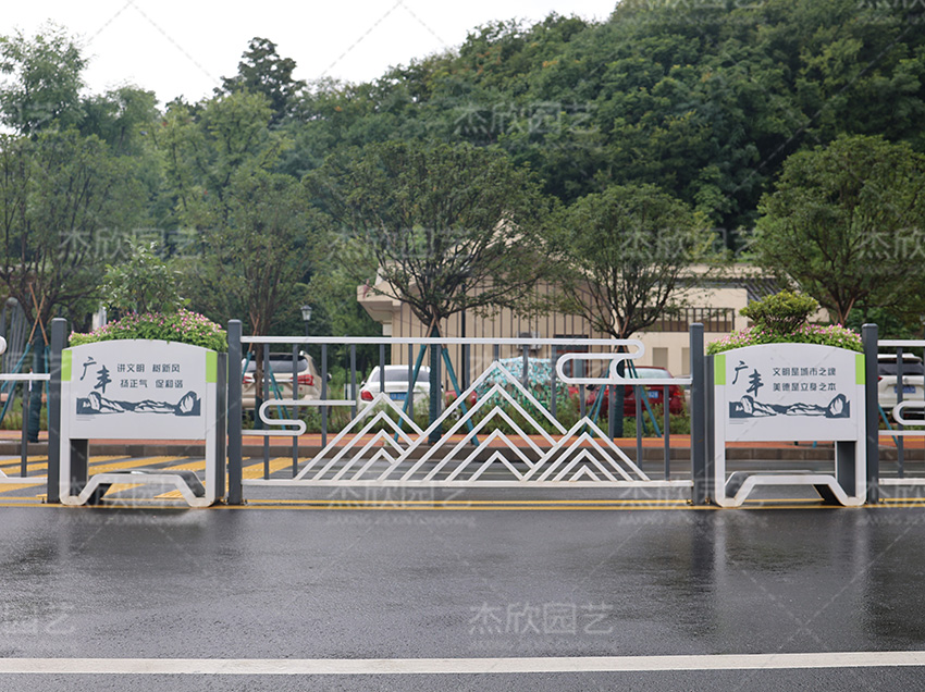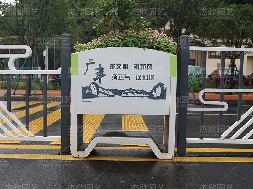 景觀護欄以山水為主元素,簡潔詩意、如臨畫境,輕盈的山水白云間,呈現(xiàn)出自然生態(tài)的飄逸感。花箱上字體與圖畫,讓人一秒走進了廣豐的天地。