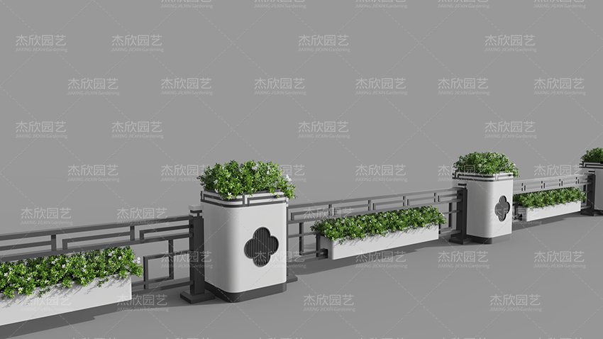 現(xiàn)代窗紋花箱,加入了窗紋元素,使得花箱更加活潑。這款花箱將現(xiàn)代和傳統(tǒng)融合,在用色上,以現(xiàn)代風(fēng)的黑白灰為主,在造型上強(qiáng)調(diào)簡(jiǎn)約。同時(shí)又加入了傳統(tǒng)元素,在護(hù)欄上增添造型,在花箱加入花卉窗紋,富有古典氣息。