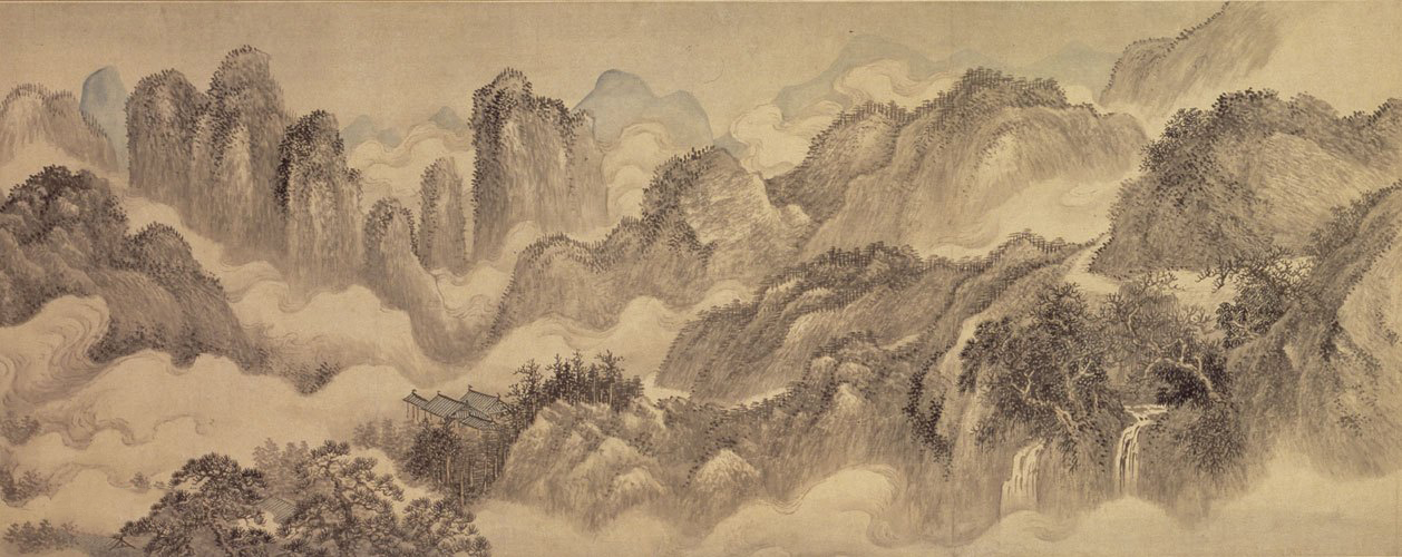 畫面上峰巒起伏,云霧迷茫,其中間的瀑布、雜樹、竹亭、山石以濃密的雨點(diǎn)皴出之。全圖工整謹(jǐn)密,秀潤蒼渾,“筆簡景少,氣壯意長”。