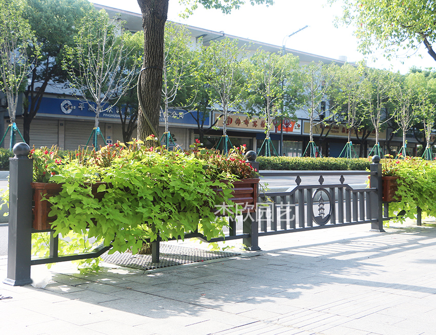 護欄花箱不同于組合花箱,護欄花箱具有道路隔離景觀作用。組合花箱的作用集中在街道景觀。護欄花箱一般由護欄和花箱組成,花箱以PVC、鋁合金為主,護欄以鋅鋼、鋁合金為主。