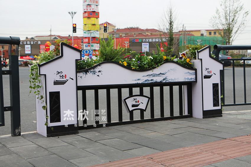 泗涇古鎮(zhèn)也保留了江南傳統(tǒng)文化的韻味,在道路花箱的選擇上,用水墨展現(xiàn)原生態(tài)的江南風景。簡化的馬頭墻、飛檐、窗格,都一一呈現(xiàn)出時代的美感。黑白看似單調(diào),但其中蘊藏著無限的生機,從無到有,從簡單到豐富,都在意境中得到滿足。
