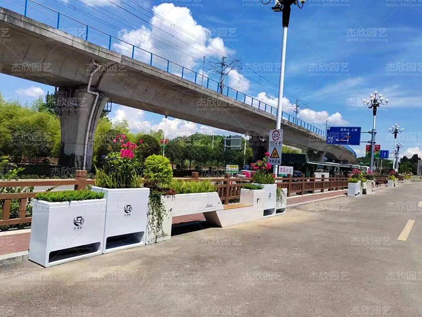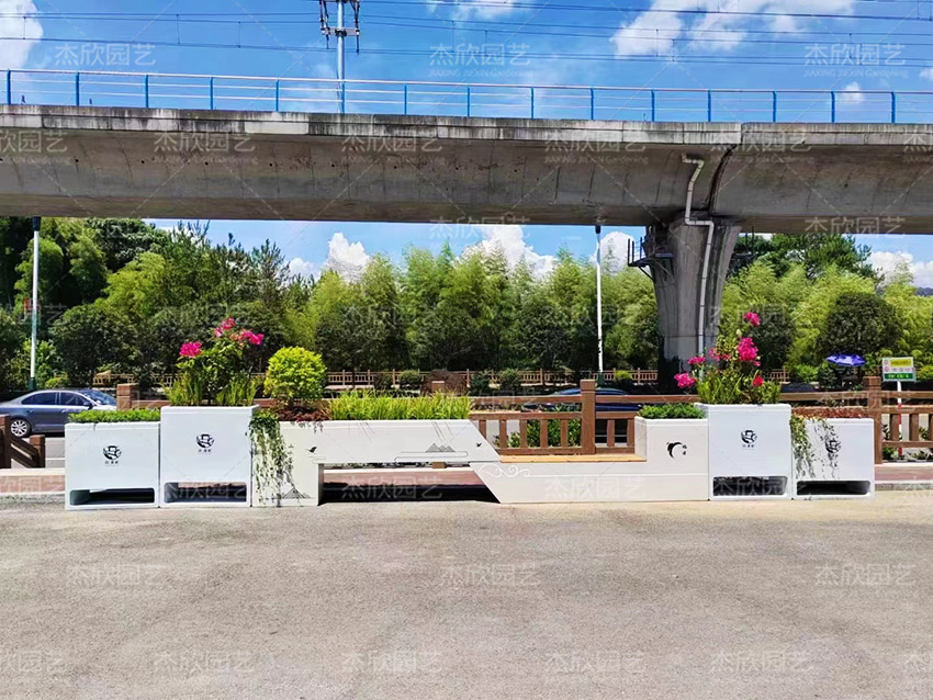 座椅花箱多見于城市街道、公園、廣場,這款座椅花箱以十足的國風韻味,傳遞出中式美學。