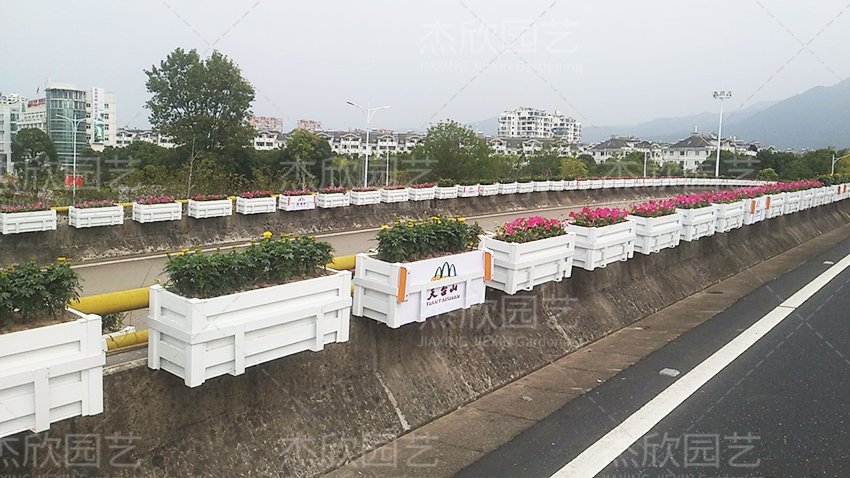 1、懸掛式花箱。懸掛式花箱安裝便利,只需要安裝在橋梁的護(hù)欄上即可。懸掛式花箱規(guī)格較小,花箱與花箱間距合理,能夠呈現(xiàn)出相當(dāng)不錯(cuò)的橋梁景觀。花箱顏色選擇以白色居多。